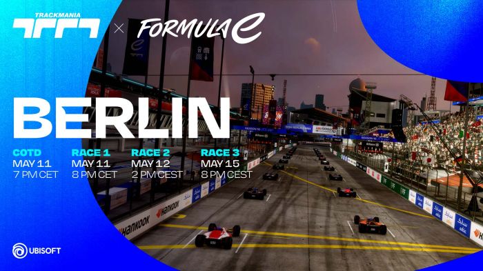 O Campeonato Mundial ABB FIA Fórmula E vai revelar sua mais recente pista de Berlim no popular jogo online Trackmania no sábado (11), mesma data da corrida alemã da categoria dos carros elétricos. O lançamento será feito em parceria com a Ubisoft, desenvolvedora do game.