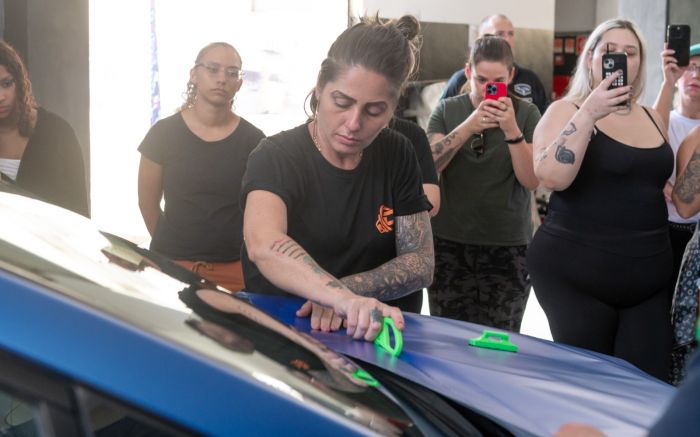 A Fórmula E promoveu, nesta quinta-feira (19), um workshop de envelopamento de carros na sede da FullPower PRO, em São Paulo (SP). O curso reuniu jovens de várias idades, principalmente mulheres.