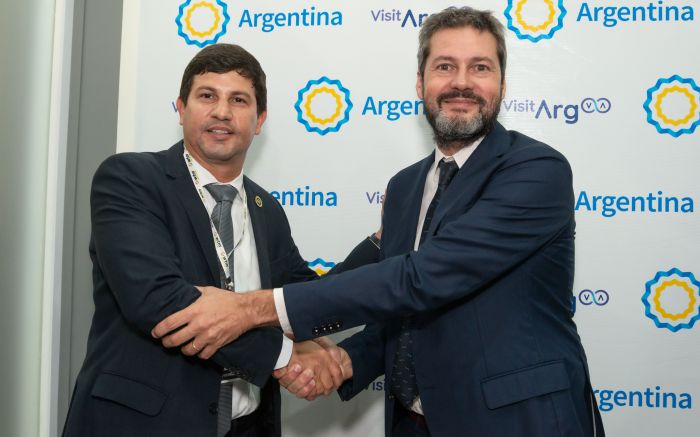 São Paulo (SP), 6 de abril de 2022 - O estande da Argentina no WTM Latin America recebeu, na tarde desta quarta-feira (6), o encontro entre os ministros do turismo argentino, Matías Lammens, e brasileiro, Carlos Brito. Os colegas de pasta falaram sobre os planos de retomada do segmento e as parceria...