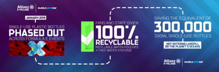 Para comemorar o Dia Mundial da Água, o Campeonato ABB FIA de Fórmula E revelou que mais de 300.000 garrafas de água de 330 ml de plástico foram salvas e não contribuem para aterros sanitários ou resíduos de plástico e poluição, como parte do programa de sustentabilidade da série de corrida totalmen...