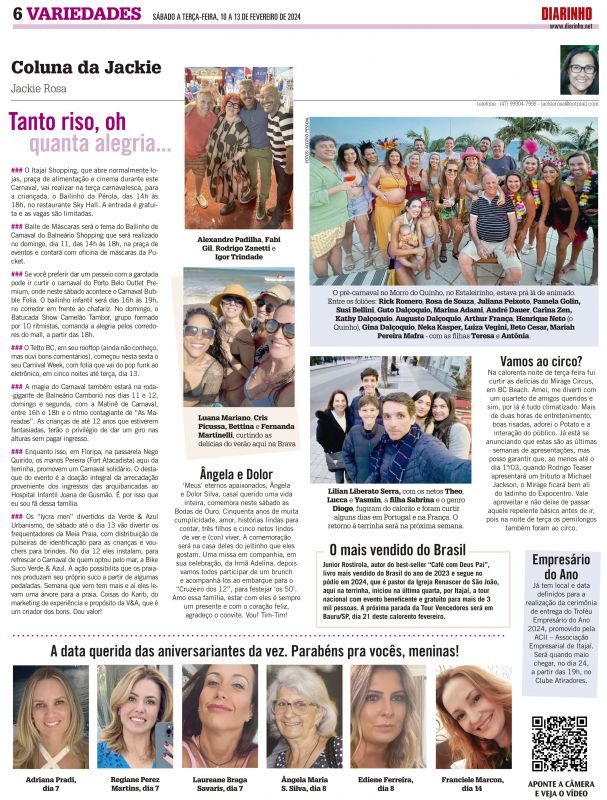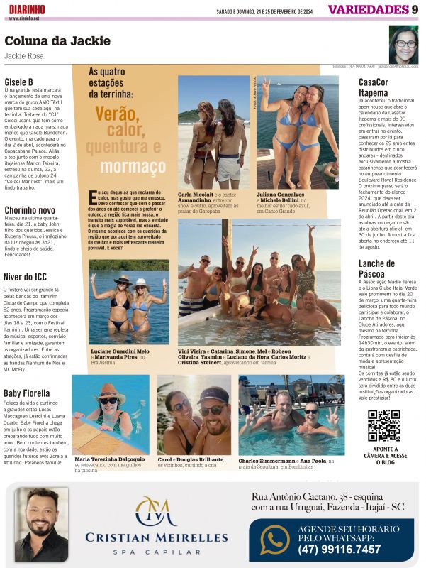 A moçada festeira da Sociedade Guarani´, que já fez alguns “ensaios” na piscina do clube, dessa vez vai se reunir para o baile pré-carnavalesco na sexta, 2 de fevereiro, na sede praiana da Brava. O “Abram Alas para o Carnaval Guarani 2024” começa às 20h, contará com animação do Manga de Cavaco + Gru...