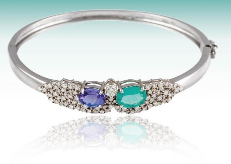 Um bracelete com esmeralda e tanzanita, com as cores verde e roxo, respectivamente, que repre...