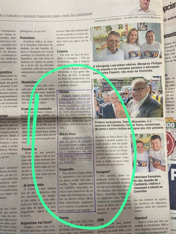 O empresário e ex-candidato a prefeito de Bombinhas, Mário Pera (PSDB), gravou um vídeo onde fala sobre ter ganho oito mil reais por danos morais do prefeito Paulinho Bagual, ops, Dalago (Podemos). Na época o alcaide em entrevista à uma emissora de rádio, detonou Mário, dizendo que ele tinha sido de...