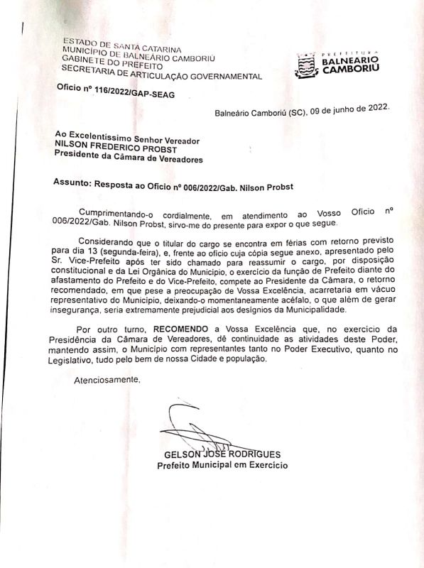 O Presidente em exercício da Câmara de Vereadores de Balneário Camboriú – Nilson Frederico Probst, em nome dos Vereadores desta Casa Legislativa, vem a público REPUDIAR a Concessionária Litoral Sul por inaugurar no dia 09/06/22 a ponte do trecho acesso sul em Balneário Camboriú sem as devidas condiç...