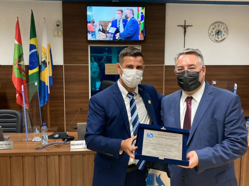 O ex-governador com cara de padreco Raimundo Colombo (PSD), foi homenageado na casa do povo do outro lado da vala, em Navega City. A proposta de uma moção de congratulações foi apresentada pelo vereador Andrew Laurentino e aprovada por unanimidade.