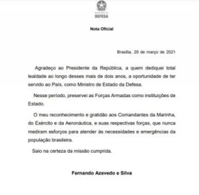 O Ministro da Defesa, Fernando Azevedo Silva, deixou o cargo na tarde desta segunda-feira. Em carta o ex-ministro agradeceu ao presidente Jair Bolsonaro (sem partido) pela oportunidade de ter sido ministro e, afirma que preservou as forças armadas como instituições de Estado. "Saio na certeza de m...