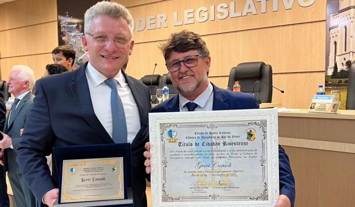 Empresário de sucesso e político em ascensão, o suplente de deputado Gerri Consoli (Republicanos), de Rio do Sul, recebeu o título de “Cidadão Rioestense” esta semana. A homenagem da Câmara de Vereadores de Rio do Oeste, cujo presidente é Silvio dos Santos (PSD), se deve ao intenso trabalho de Gerr...