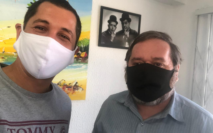 O presidente do Podemos, vereador futebolista e coordenador dos candidatos a vereador da coligação do atucanado Robson Coelho (PSDB), o vice, o bonzinho Edson Lapa (PSL), fez uma visita de cortesia ao pançudo escriba. Foto (Divulgação)