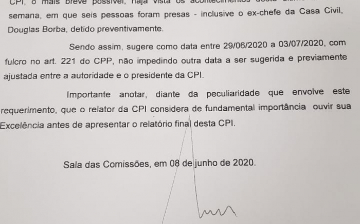 Requerimento do relator deputado estadual, o entisicado Ivan Naatz (PL) aprovado na sessão da CPI dos Respiradores na leleia, antes de iniciar a acareação, que varou a noite de ontem, para que o governador-bombeiro Carlos Moisés (PSL), seja ouvido, diante dos últimos acontecimentos envolvendo a pris...