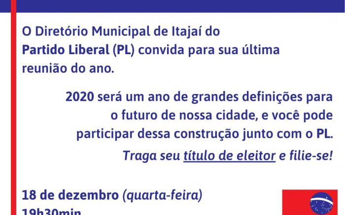 O Diretório do Partido Liberal (PL) peixeiro, realiza hoje, na sua sede na rua Blumenau, 2017, a partir das 19h30, sua última reunião do ano. Marcar presença O presidente da sigla em Itajaí, o Topetudo Osvaldo Gern e o vice-presidente estadual, Jorge Goetten, tão convidando o povo pra ir lá, l...