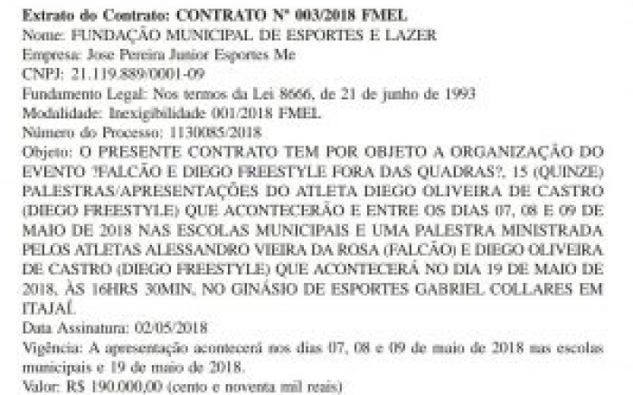 No último Jornal do Município de Itajaí foi publicado processo de inexigibilidade de contratação que tem por objeto a organização do evento Falcão e Diego Freestyle fora das quadras. Não fecha a conta Bocudos de plantão querem saber como serão ministradas 15 palestras em três dias pelo mesmo atl...