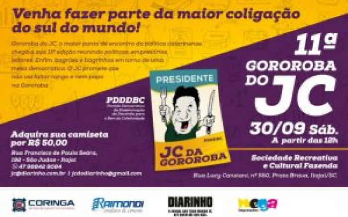 No dia 30 de setembro na sociedade Fazenda Praia Brava, acontece a 11ª Gororoba do JC, que este ano tem como mote de campanha a eleição do JC para presidente pelo Partido Democrático da Disseminação da Discórdia para o Bem da Coletividade (PDDDBC). Para votar no JC é só adquirir a camiseta do evento...