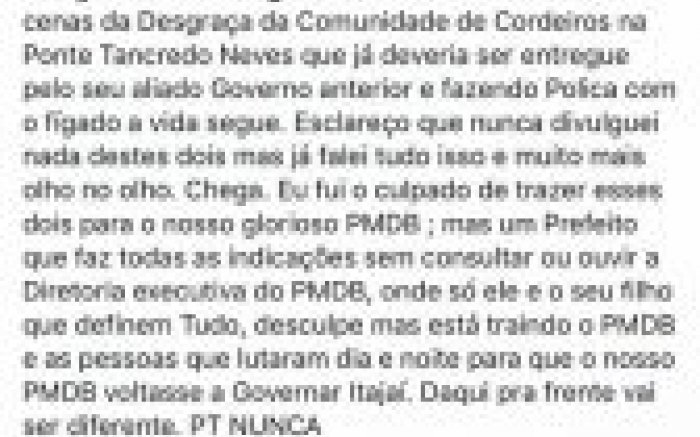 O presidente do PMDB peixeiro, o ex-vereador bigodudo Laudelino Lamim, que havia encaminhado ofício ao prefeito barbudinho, Volnei Morastoni, marcando uma reunião da sigla para o dia 13 de abril pra avaliação dos cem dias, não aguentou esperar e começou a quarta-feira de cinzas azucrinando. Em posta...