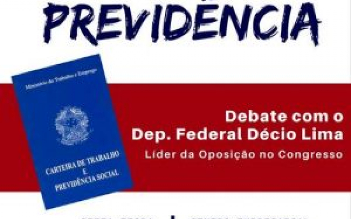 Última hora: O evento anunciado pelo vermelhinho, Décio Lima, foi cancelado, com agendamento para o próximo dia 10. O deputado federal e líder da oposição na câmara federal, em Brasólia, Décio Lima (PT), promove nesta sexta-feira na city peixeira, um debate sobre a polêmica Reforma da Previd...