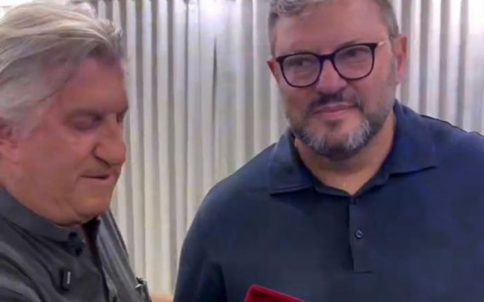 Sem combinar a cor da camiseta, o ex-tudo prefeito Leonel Pavan (PSD) e o ...