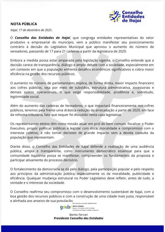 O Conselho das Entidades de Itajaí pegou na corda com as excelências excelentíssimas da piramidal casa do povo que de supetão aumentaram o número de cadeiras de 17 pra 21 a partir da próxima legislatura, em 2029.