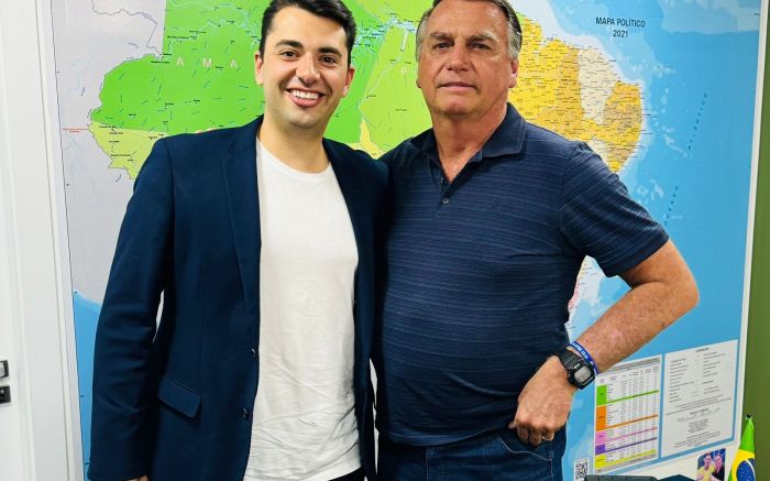 Guilherme Cardoso, o Gui, pré-candidato a vereador na Dubai brasileira pelo PL 22, ao lado do ex-presidente Jair Bolsonaro (PL) no início da semana - representando a cidade.