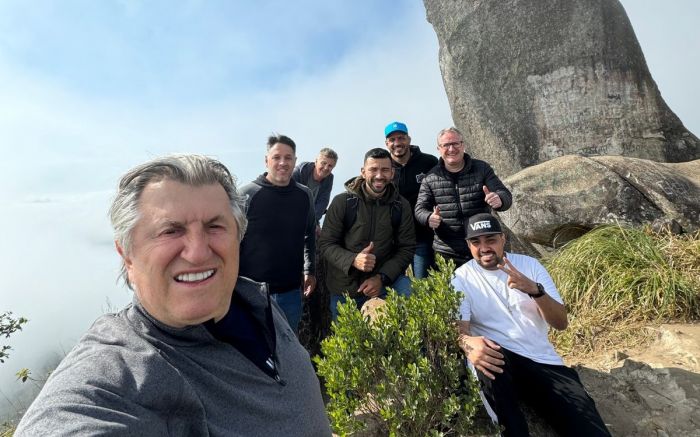 O pré-candidato a prefeito da capital da pedrada, Camboriú, o ex-tudo Leonel Pavan (PSD), acordou animadaço e fez uma caminhada até o pico da pedra, ponto mais alto da capital catarinense do tiro ao vereador.