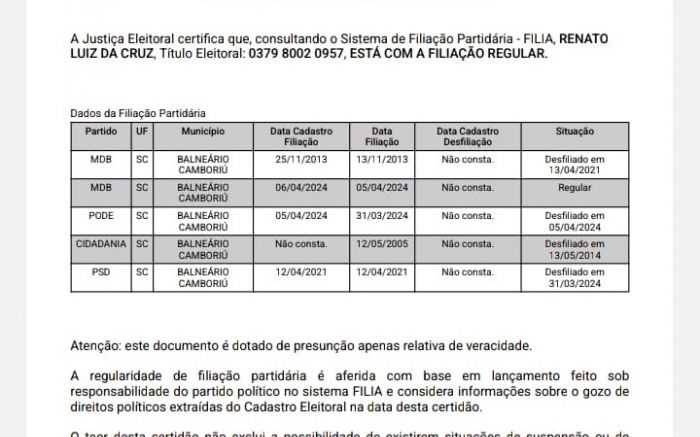 Este colunista Abelhudo e Zarolho, recebeu certidão de filiações partidárias do pré-candidato a vice pelo MDB de Dubai brasileiro, o presidente do Camboriú Futebol Clube, Renato Cruz.