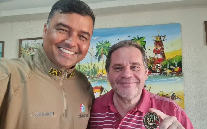 O Coronel da Polícia Militar da Santa & Bela Catarina, Jefferson Schmidt, comandante da 3ª Região com sede em Balneário Camboriú e que engloba 17 cidades e mais de um milhão de habitantes, fez uma visita de cortesia ao socadinho escriba.