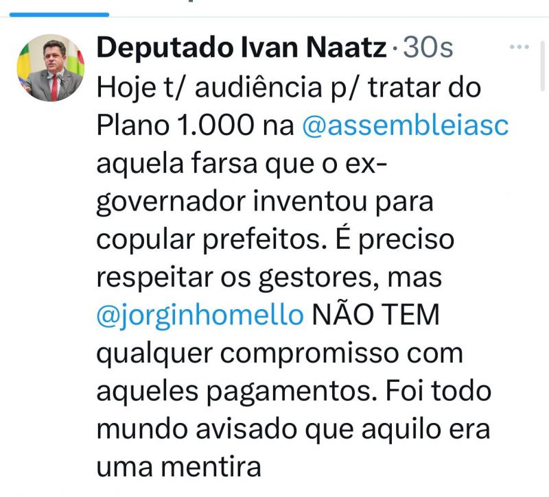 O deputado estadual bocudo e entisicado, Ivan Naatz (PL), em postagem nas redes sociais, afirmou que o Plano 1000 do então governador Carlos Moisés (Republicanos), era uma mentira e, foi pra "copular" prefeitos. Ui!