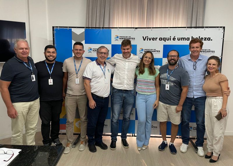 Efetivos e comissionados da secretaria de Comunicação da prefa do outro lado da vala, em Navega City, em reunião no Gabinete do prefeito Liba Top, ops, Fronza (União Brasil), com a presença do novo gestor da pasta, Aldo Decker.