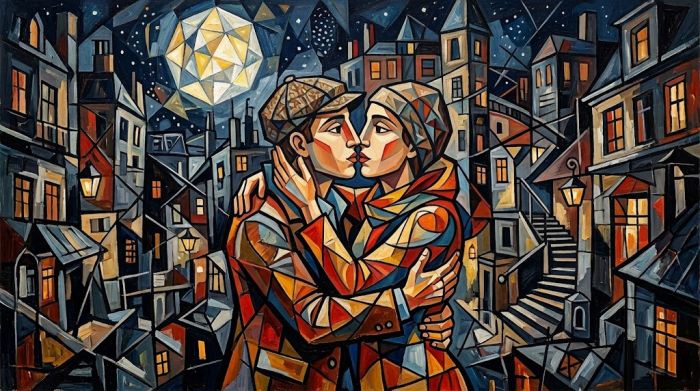 Escrevi esse olhando para uma cena comum: a cidade fria, a lua de inverno iluminando tudo com aquela luz distante… e, no meio disso, duas pessoas se encontrando. Um beijo. Calor humano no meio do frio.