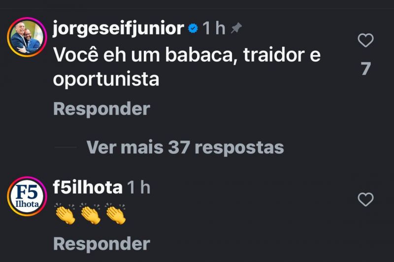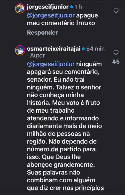 Foi o que bastou pra Seif xingar o Osmar de "babaca, traidor e oportunista". Pra um tempo depois pedir para que o Osmar apagasse o comentário que havia feito. Osmar disse que não iria apagar e relembrou que os mais de 43 mil votos que fez no último pleito foi decorrente do seu trabalho de comunicador, sem usar partido pra escada... Eitcha!
