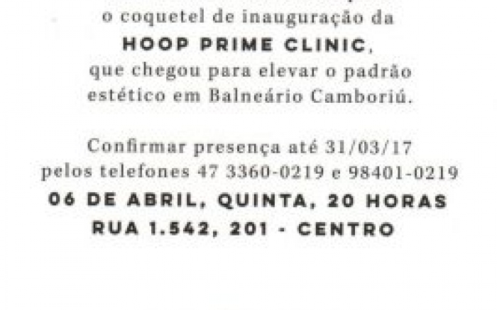 Hoop Prime Clinic A novidadeira Cambú Beach, que hoje recebeu pela primeira vez um transatlântico na orla, inaugura nesta quinta cheia de atrações, às 20h, o Hoop Prime Clinic, um hospital que atenderá pacientes particulares e de convênios prestando serviços assistenciais nas especialidades de oftalmologia, otorrinolaringologia, além de cirurgia plástica, através de uma equipe de profissionais formada pelos médicos José Alfredo Wittmann, José Alberto Dantas, Luiz Cardoso de Melo, Ione Zandona Lopes, Fábio Alberto Roloff, Alessandro Verona e Sérgio André Bucci Fernandes. O centro médico não terá pronto-socorro e atenderá apenas cirurgias previamente agendadas. Conta com 1.200 metros quadrados de área construída com dois pavimentos, duas salas de cirurgia, uma sala de recuperação, seis suítes, além de nove consultórios. Convite veio do amigo Ariel Silva que está fazendo assessoria do espaço. Se eu conseguir sair cedo da Schutz Party quero dar uma passada prá ver tudinho de perto!