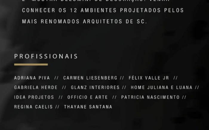 Carla Pereira será a anfitriã da noite desta terça-feira, amanhã, em Itapema, quando recebe para abertura da 2ª Mostra de Decoração Delumini que este ano terá como tema: celebrar. A Mostra terá 12 ambientes, assinados por: Adriana Piva que assina o Gold Living, Regina Caelis, fez o Serenity Composições Agradáveis, Idea Projetos o living O verde Inspira, Felix Valle Jr assina o Espaço Luce, Gabriela Herde a Sala de Jantar Buona Sera, Glanz Interiores o Home Office do executivo, o Officio e Arte fez a Suíte Rose, Patricia Nascimento a Varanda da Praia, Thayane Santana o Lounge Pantopolista, Home Juliana e Luana o Spazio Grigio, Liesenberg Arquitetura & Design fez o Lounge de Recepção e o Officio e Arte assina Metamorfose Um desafio que Transforma. A Mostra pode ser visitada de segunda a sábado, das 9h às 18h e a entrada é gratuita, em Itapema. Me acompanhe nas Redes Sociais: Instagram | Facebook |