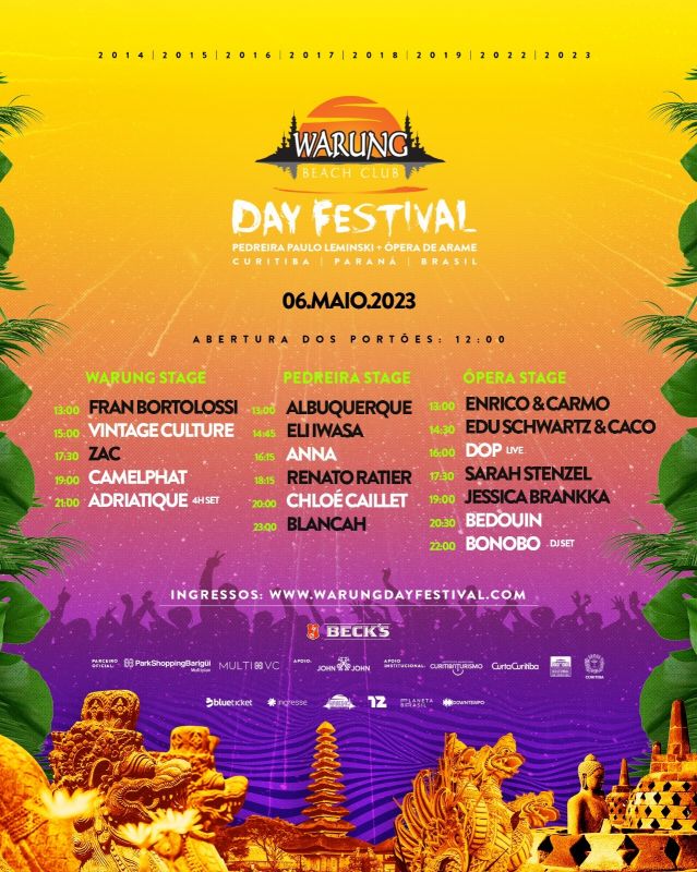 Chegou o momento de conhecer horários e palcos das atrações selecionadas especialmente para a 8ª edição 2023 do Warung Day Festival (WDF), que acontece neste sábado (6), na Pedreira Paulo Lemisnki, em Curitiba (PR). Com a chancela e curadoria do Warung, o evento contará com uma mescla de nomes inéditos e consagrados internacionalmente em diversos gêneros, como techno, dance music e deep house.