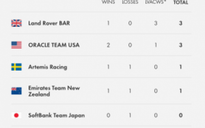 Os detentores do título, os norte-americanos do Oracle Team USA abriram as provas contra os franceses Groupama Team France. O time de Jimmy Spithill passou com sobras pelos adversários comandados por Franck Cammas, que já foi campeão da Volvo Ocean Race.