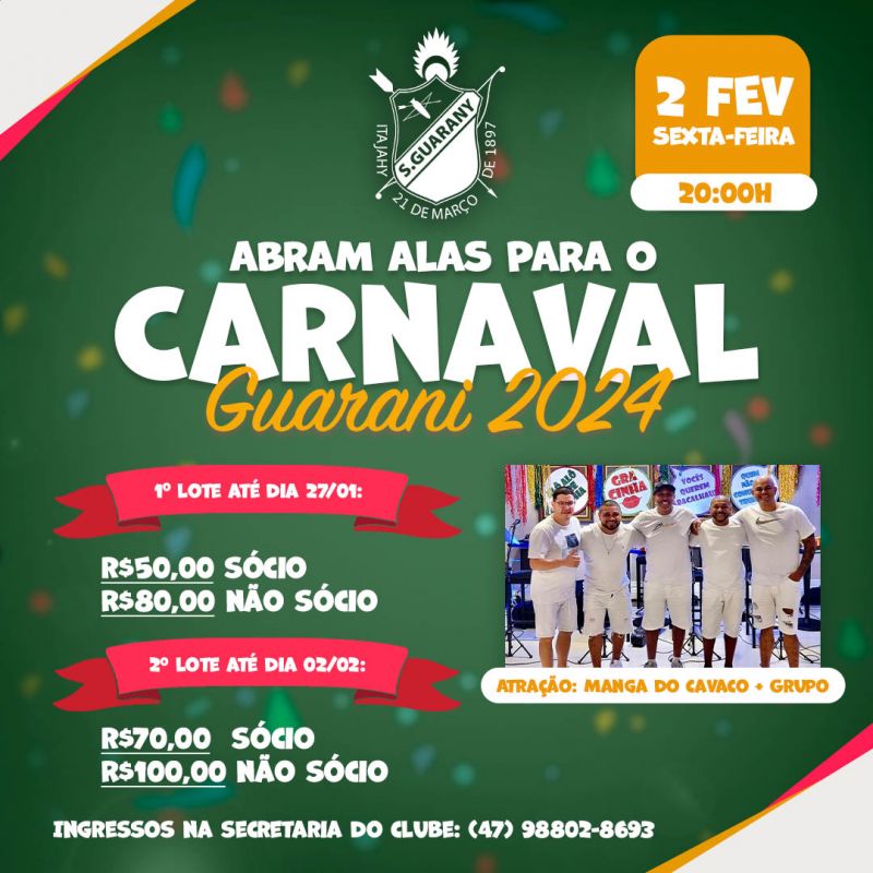 A moçada festeira da Sociedade Guarani´, que já fez alguns “ensaios” na piscina do clube, dessa vez vai se reunir para o baile pré-carnavalesco na sexta, 2 de fevereiro, na sede praiana da Brava. O “Abram Alas para o Carnaval Guarani 2024” começa às 20h, contará com animação do Manga de Cavaco + Grupo e possui ingressos à venda. Sócios pagam 70 reais e não sócios 100,00.