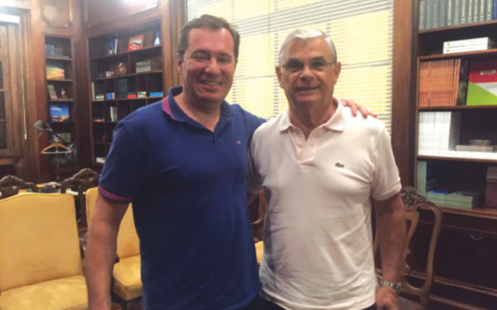 Prefeito pop star, Fabrício Oliveira (PSB), e o secretário nacional de Desenvolvimento Humano, Halim Girade, em mega evento nacional de capacitação voltado à pessoa idosa, ontem, na Dubai brasileira. BC aderiu ao programa nacional de estratégia da pessoa da melhor idade