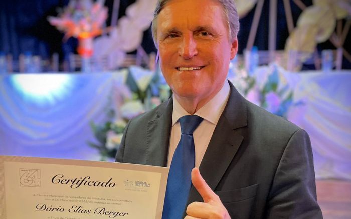 O senador Dário Berger recebeu essa semana o título de Cidadão Honorário do município de Imbituba. A honraria foi concedida por indicação do vereador Renato Figueiredo, o Ladiada, e entregue na sessão solene de comemoração do aniversário de 64 anos de emancipação político-administrativa da cidade.