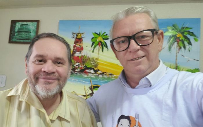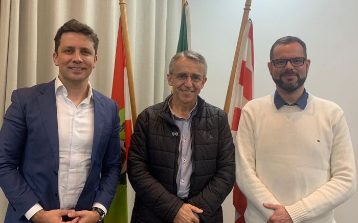 O candidato ao Senado, Jorge Seif, o zero meia (PL), se reuniu nesta quinta-feira com o prefeito da galega Blumenau, Mario Hildebrandt (Podemos), para receber as demandas da cidade. Acompanhou a conversa o também prefeito e coordenador da campanha de Seif, o pop star Fabrício Oliveira (Podemos).