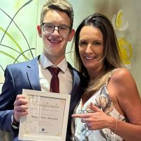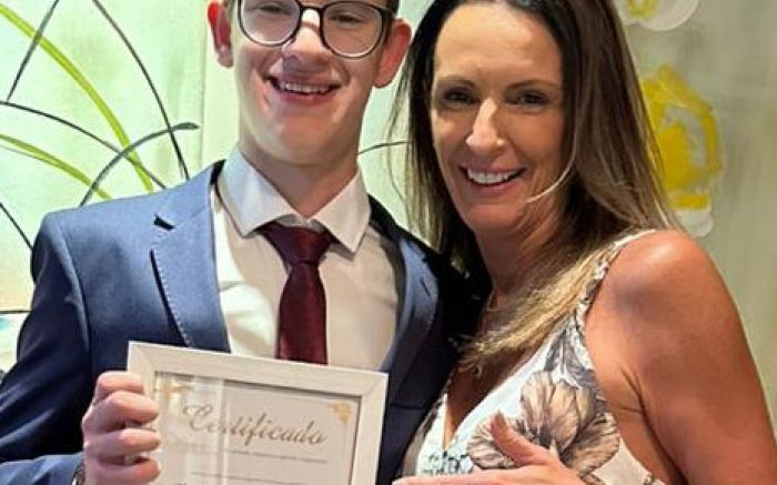 Thiago Klaser Henschel, em noite de formatura e que ele recebeu a Honra ao Mérito por atitude, respeito e espírito cooperativo, comemorando o momento com a mãe Alessandra. Parabéns!
