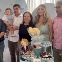 No batizado do pequeno Tom Dagnoni Coelho, os pais Robison e Cris, o bisavô Nino Ferreira e os tios Jucelia, Zé e Márcia Fernandes.