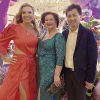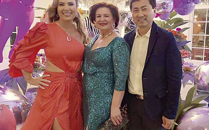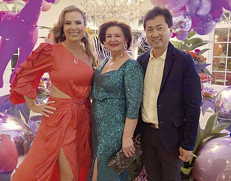 A aniversariante Daniela Testoni, ao lado do casal Rita de Cássia Soares e Sandro Mikio Kakuda, no festão que promoveu na Casa Medina, em Estaleirinho.