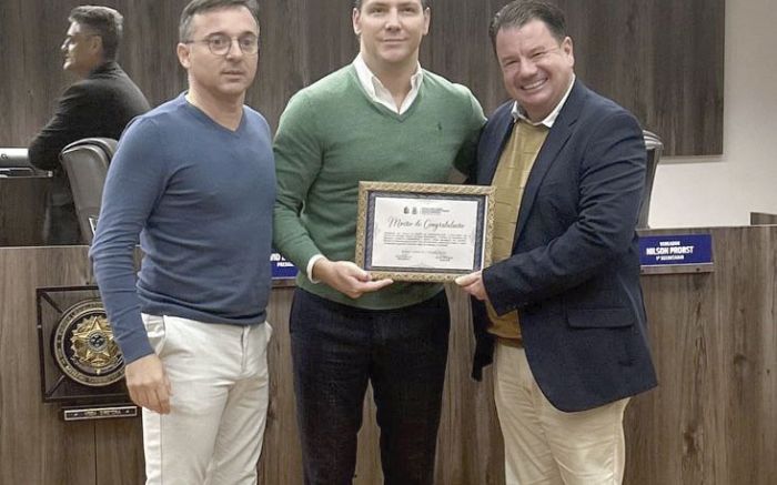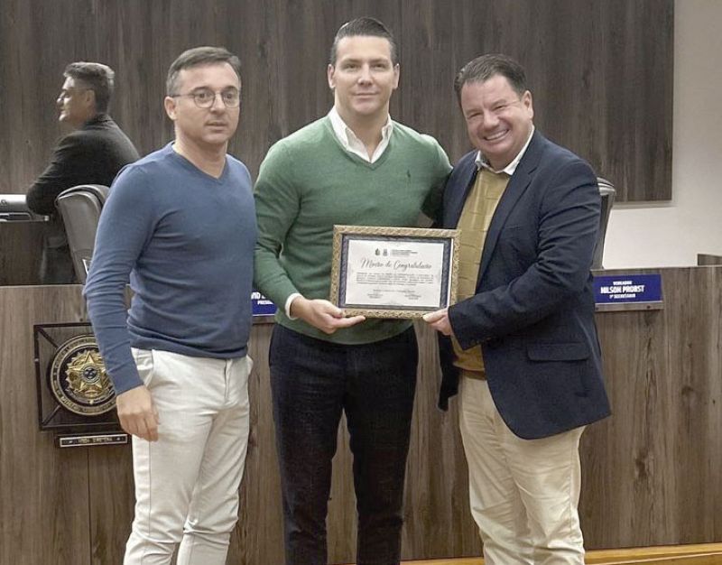 O empresário Rafael Meneghelli recebeu uma moção de congratulação da Câmara de Vereadores de Balneário Camboriú. A homenagem foi proposta pelo vereador Gelson Rodrigues. Rafael é sócio do restaurante Aragon, que se tornou um ponto turístico-gastronômico ao oferecer uma das vistas mais privilegiadas da orla de Balneário Camboriú. Na foto, Rafael aparece entre os vereadores David La Barrica e Gelson Rodrigues. (Foto: Divulgação)