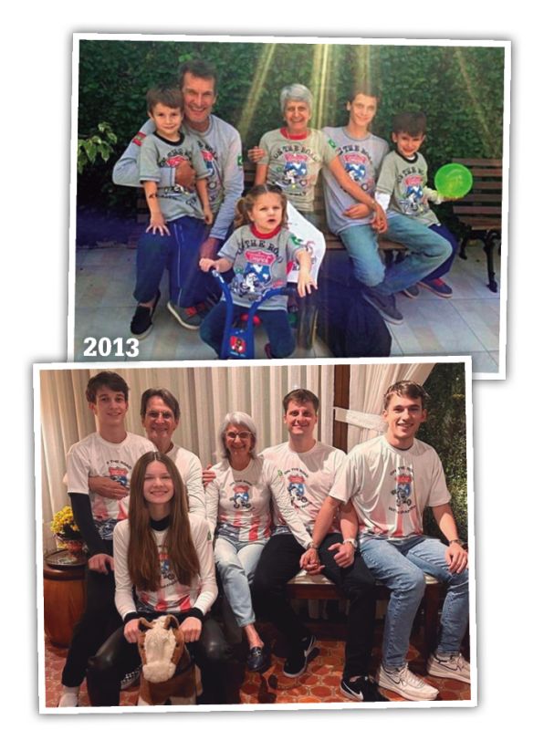 Dolor Silva e Ângela, lá em 2013, quando aconteceu a primeira trip com os netos: Mateus, Clara, Pedro e João, e na última terça, dia 9, antes do embarque da “On the road with Grandpa”