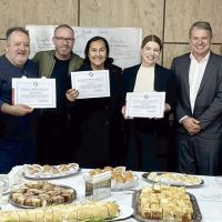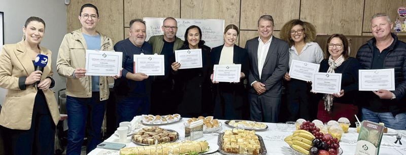 Os colegas da imprensa homenageados: Calebe Moreno, Carlos Bittencourt, eu, Fabi Smania, Grazielle Guimarães, Chris Pinheiro e Carlos Magagnin, juntos com o presidente da Associação, Maurício José Gom e o jornalista Ricardo Ruas, da Oficina da Palavras