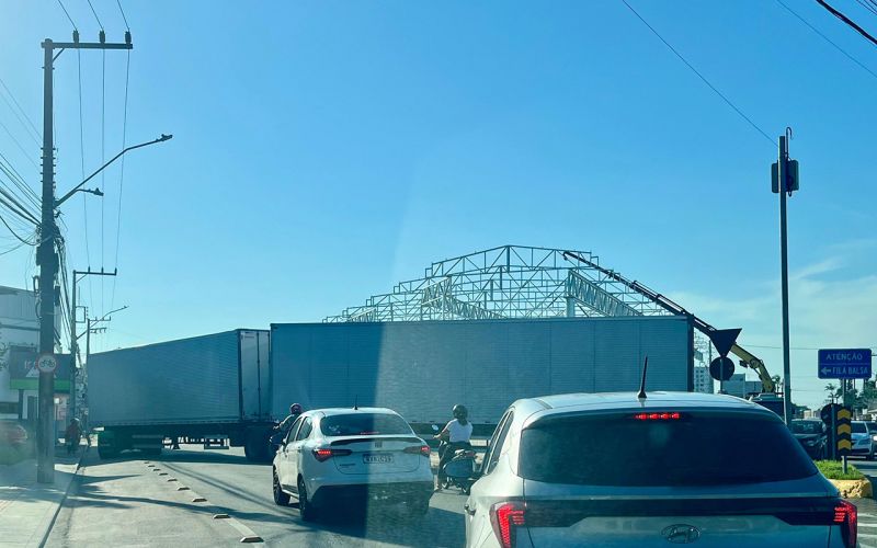 O (des) governo morastoniano liberou empresas de logística que utilizam carretas e caminhões bitrens no Imaruí e na Barra do Rio, onde as estreitas ruas não suportam. Continuador do (des) governo Volnei, o atual governo ignora o trânsito. Esse bitrem atravessado na foto é bem em frente à Codetran. Acordem!