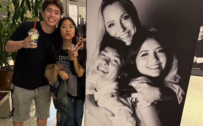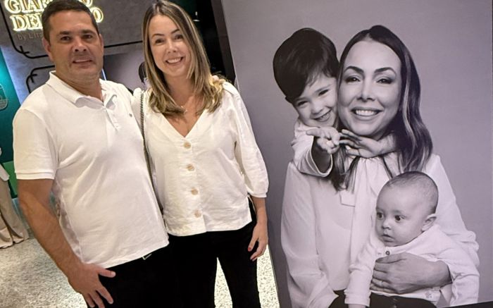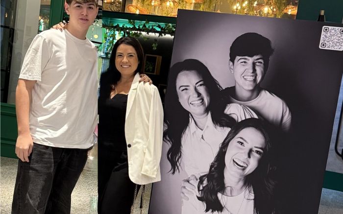 Caio Moretti foi conferir a homenagem que ele e a Clara fizeram à mãe deles, Aline Aranha