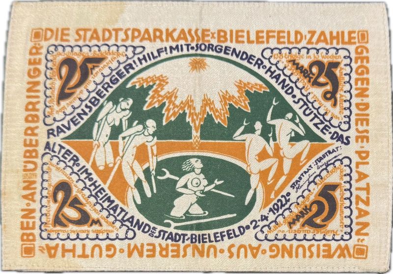 • Tecido e seda: Um exemplo icônico são os Notgelds de Bielefeld, feitos com tecidos finos e estampas detalhadas.