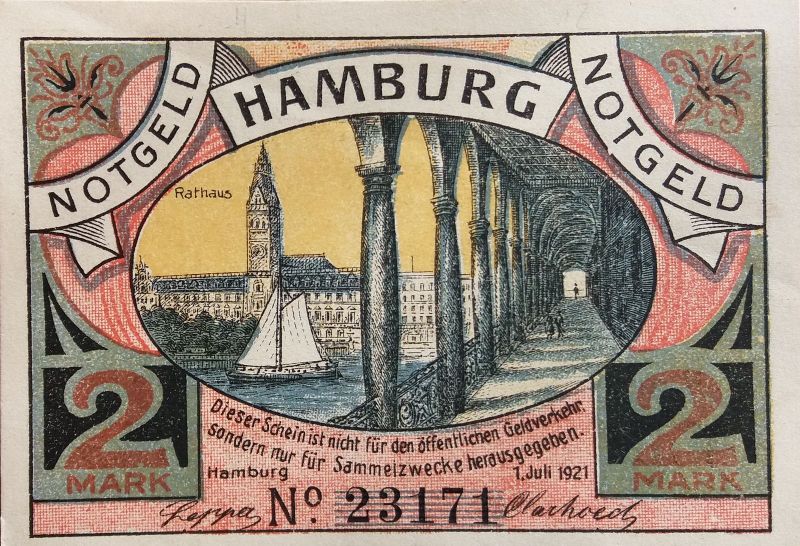 • Papel: Muitas notas eram impressas em papel comum, mas com ilustrações coloridas que faziam referência à cultura local como exemplo os de Hamburgo.