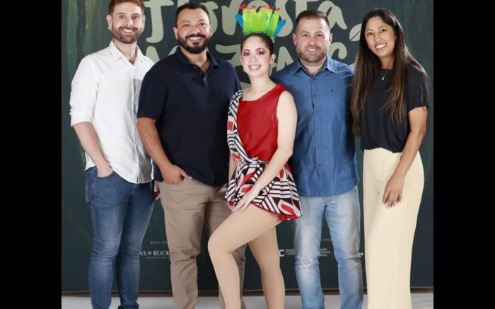 A bailarina Duda Meirelles, com seus familiares: Kelvin Visconde, Cristian Meirelles, Eduardo Ferreira e Barbara Meirelles, logo após a apresentação do espetáculo de ballet clássico, Floresta Amazônica que foi um sucesso.