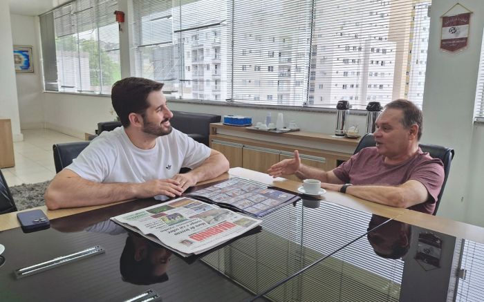 O JC fez uma visita de cortesia ao prefeito Robison Coelho (PL) e encontrou o presidente da piramidal, o entisicado Fernando Pegorini (PL) (Foto: Divulgação)