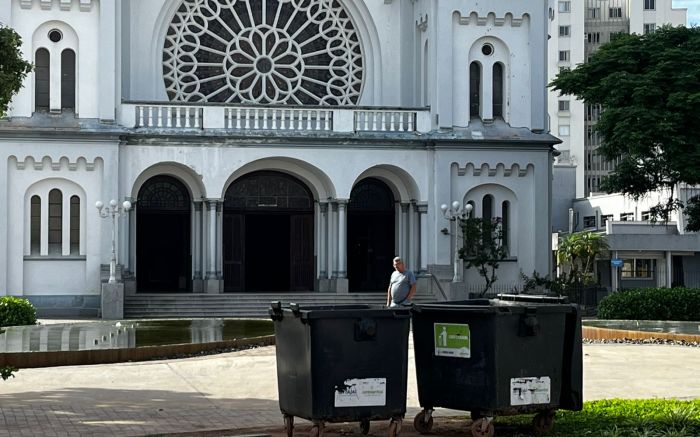 Prefa de Itajaí coloca grandes latões de lixo em frente a pontos históricos e muito fotografados da cidade, como em frente à Matriz, Bico do Papagaio e o Palácio Marcos Konder. É mole?