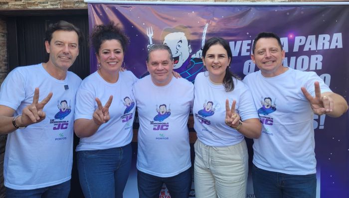 Os candidatos a prefeito e vice do PL pexêro, Robison Coelho e Rubens Angioletti, acompanhados do ex-prefeito Jandir Bellini (PP), do presidente do PP de Itajaí, Tarcísio Zanelatto, e da ex-vereadora Iraci Sodré estarão na 16ª Gororoba do JC